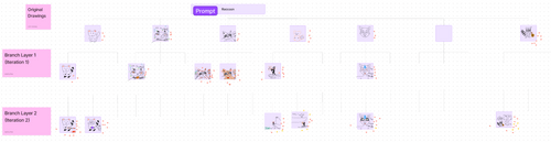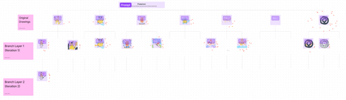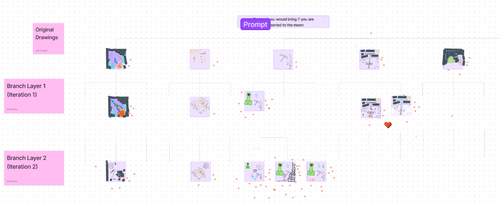 We conducted our first prototype remotely through Zoom. We used FigJam to simulate the drawing and branching process. We divided 18 participants into three groups for 3 prompts to test how people react to different prompts. The first group did a broad prompt of “Pokemon”; the second group did a specific prompt of “Raccoon”; the last group did a very broad prompt of “One tool you would bring if you are teleported to the moon." We spent 5 minutes introducing our idea and demoing our FigJam prototype.
