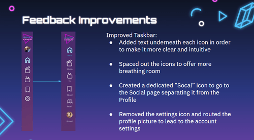 Based on our style guide, we created all the screens of the application that we wanted to show off. This included all the feedback we received from lo-fi testing. Overall, we just fleshed out the prototype a lot more. We then ran a couple of user tests on this hi-fi prototype to see what else we would have to change. Below is a list of all the changes from our first iteration: